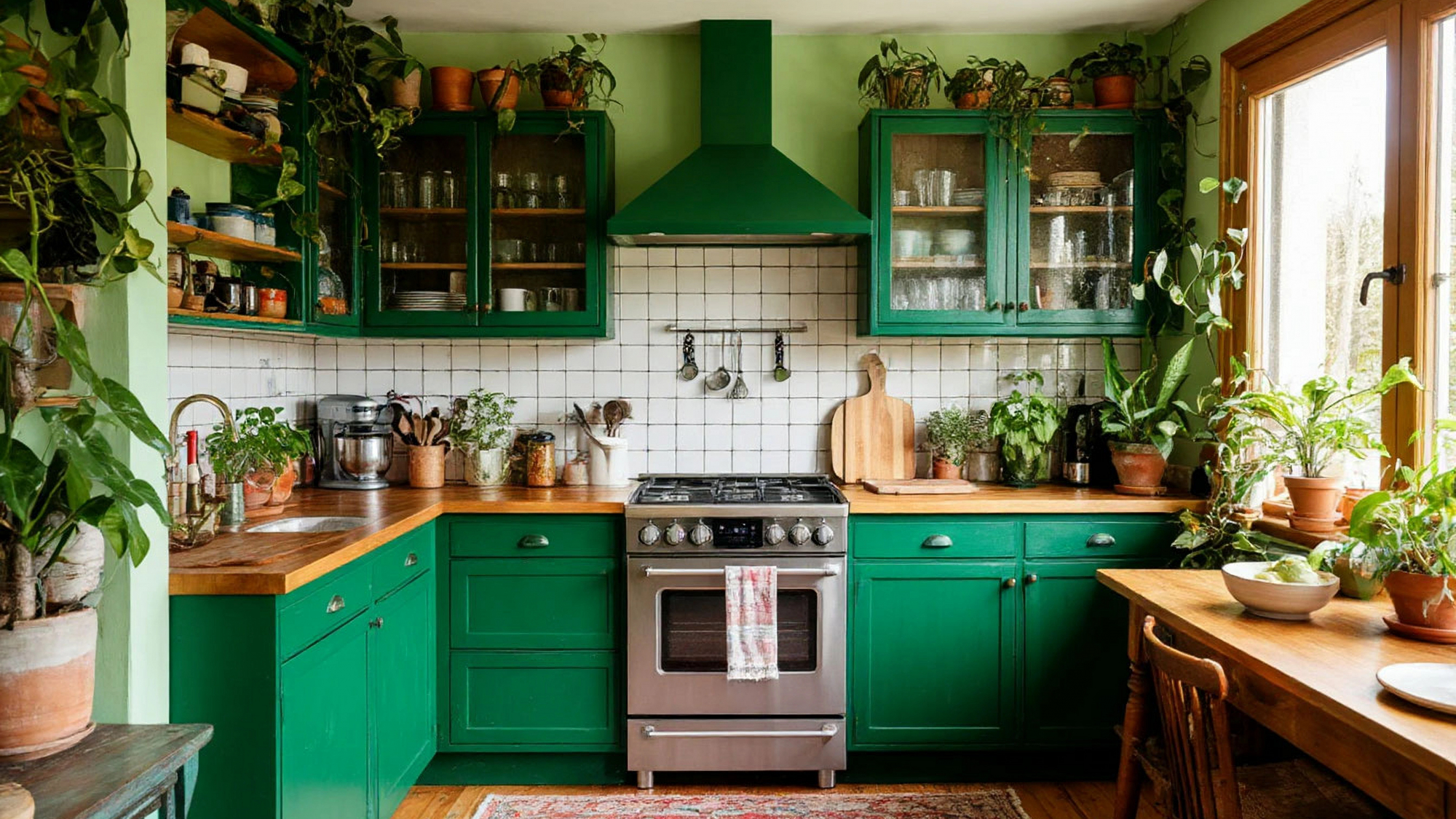 Освещение играет ключевую роль: мягкий рассеянный свет подчёркивает текстуры фасадов, зелёный цвет становится более насыщенным и живым, а рабочие зоны подсвечены так, чтобы процесс приготовления пищи был максимально комфортным. Встроенные LED-ленты, подвесные светильники и локальные источники света создают гармоничное сочетание функциональности и эстетики, подчёркивая каждый декоративный элемент кухни.